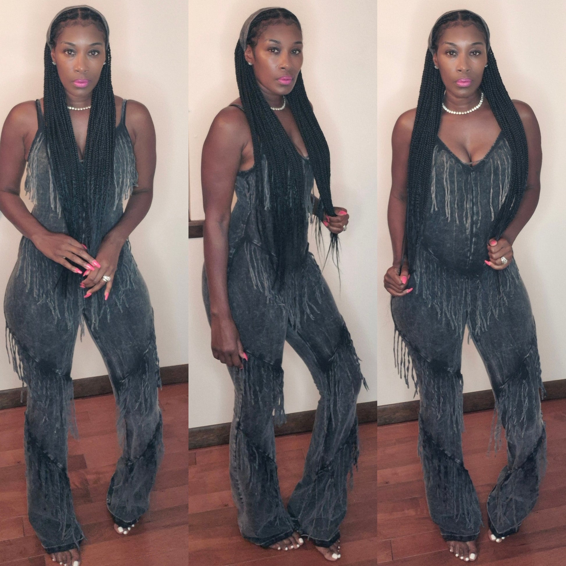 Mineral wash jumpsuit comes with matching headband- Tiered fringe detail - sleeveless - bodycon- Tall girl- friendly stretch